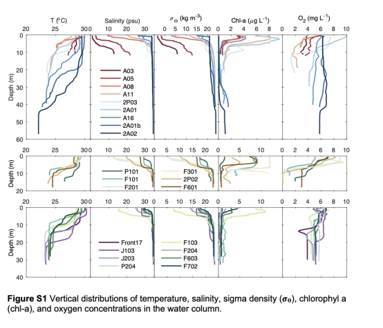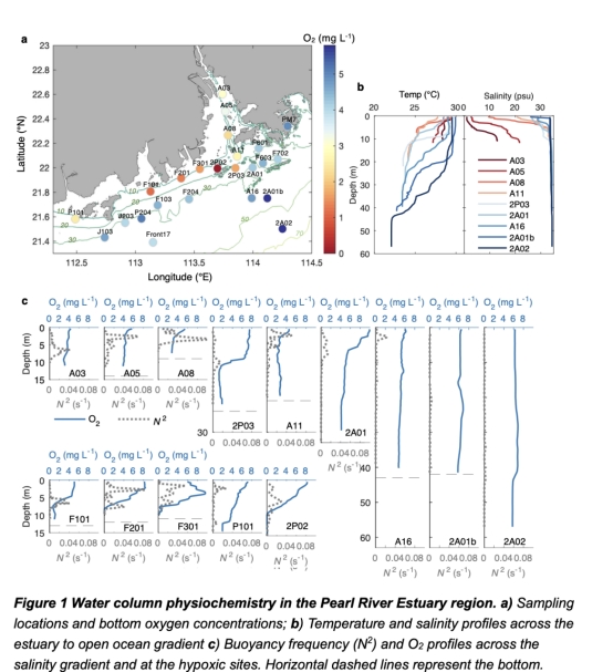 (1)水柱數(shù)據(jù)(溫度、鹽度、密度、溶解氧,圖1和表S1):揭示分層對(duì)底部氧氣補(bǔ)給的限制作用。