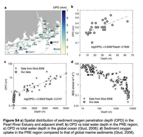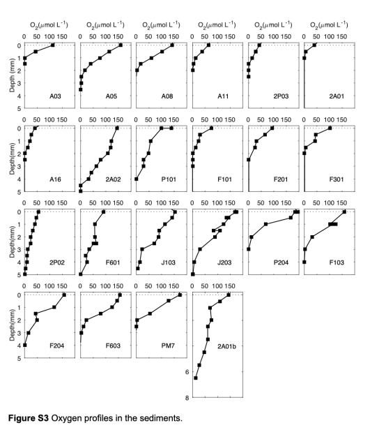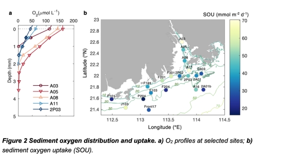 微剖面技術(shù)(0.5–1 mm分辨率)精確測(cè)定沉積物-水界面氧梯度(圖2a),顯示氧滲透深度僅2–7 mm(表S1),表明劇烈氧消耗。