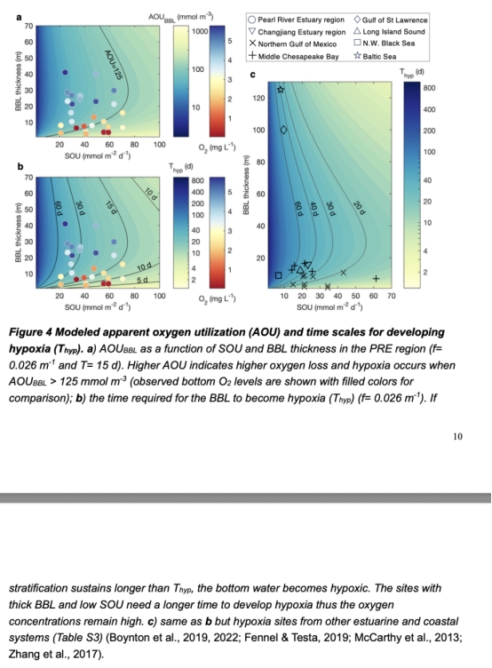 (3)質(zhì)量平衡模型成功量化缺氧形成時(shí)間(圖4b-c),并解釋跨系統(tǒng)差異(如墨西哥灣缺氧時(shí)間更長(zhǎng))。