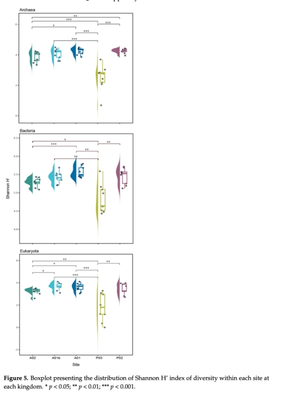 微生物多樣性(圖5):Shannon指數顯示細菌多樣性最高,P03站點多樣性最低,提示該區域環境壓力顯著。