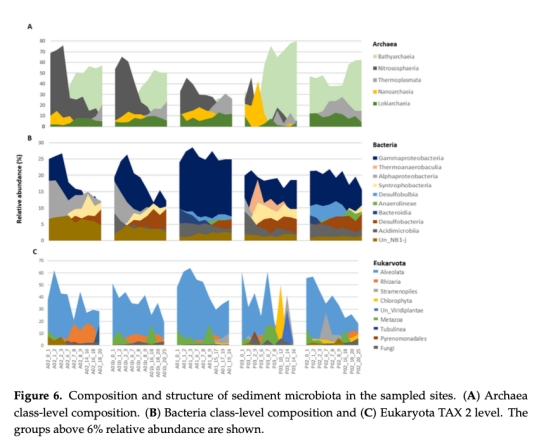 細菌中Gammaproteobacteria為優勢類群,深層沉積物中Desulfobacteria(硫酸鹽還原菌)豐度升高。