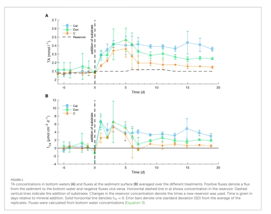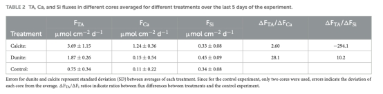 方解石組平均TA通量3.69±1.15 μmol cm?2 d?1,橄欖巖組1.87±0.26 μmol cm?2 d?1,對照組0.75±0.34 μmol cm?2 d?1。