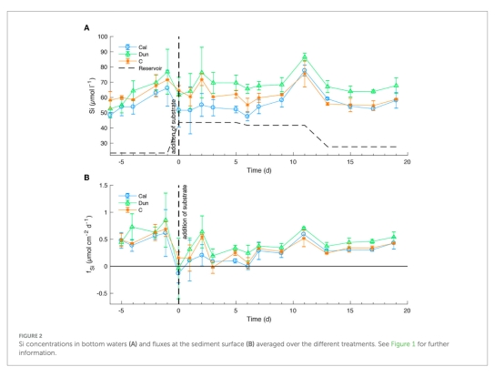 研究通過在波羅的海缺氧至低氧沉積物中添加橄欖巖(dunite)和方解石(calcite),評估其增強底棲風化(EBW)對二氧化碳去除的潛力。實驗模擬夏季底層水低氧條件,發現方解石和橄欖巖的添加分別使堿度通量增加2.94和1.12 μmol cm?2 d?1,顯著高于冬季條件下的結果。缺氧階段堿度通量最高,鈣(Ca)和硅(Si)通量證實礦物溶解是主要貢獻。方解石溶解速率與北太平洋實測值一致,橄欖巖溶解速率符合實驗室動力學模型。研究提出在波羅的海季節性缺氧區域,方解石是更高效的EBW材料,底層水腐蝕性是礦物溶解的主要驅動力。