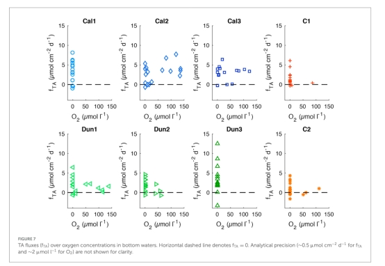 意義:量化EBW對堿度提升的貢獻,驗證方解石的高效性(缺氧條件下TA通量比富氧條件高2.5倍)。數據來源:圖1B顯示TA通量隨缺氧階段顯著升高,表2對比不同處理組的通量差異。