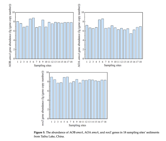 機制解析:結合功能基因(AOB amoA、AOA amoA、nosZ)豐度(圖5)和DOM組分分析,闡明硝化-反硝化耦合過程。