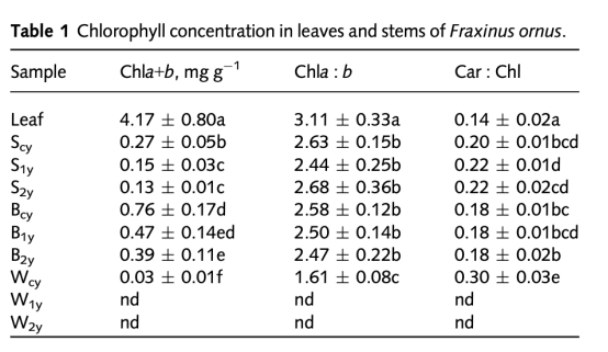色素分析:測定葉、莖、樹皮和木材的葉綠素和類胡蘿卜素含量(表1)。