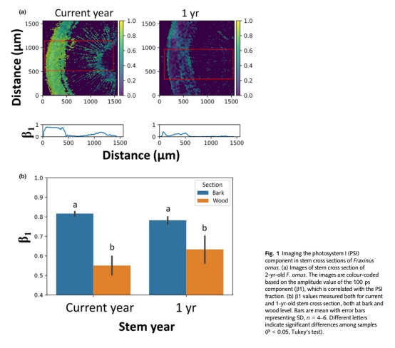 本研究通過微傳感器技術(shù)和熒光壽命成像顯微鏡(FLIM),首次系統(tǒng)評估了木本植物(以花楸樹為例)莖部不同組織(樹皮和木材)的光合作用能力及其對氧氣釋放的貢獻(xiàn)。研究發(fā)現(xiàn),光照條件下莖部整體、樹皮和木材均能產(chǎn)生氧氣,且年輕莖的氧氣產(chǎn)量和暗呼吸速率高于老莖。樹皮是莖部凈氧氣生產(chǎn)的主要貢獻(xiàn)者,但木材葉綠體也具有光合活性。FLIM分析顯示木材葉綠體的PSI比例低于樹皮,表明莖部葉綠體能夠適應(yīng)內(nèi)部光譜環(huán)境。研究揭示了莖部光合作用在維持局部氧氣平衡中的作用。