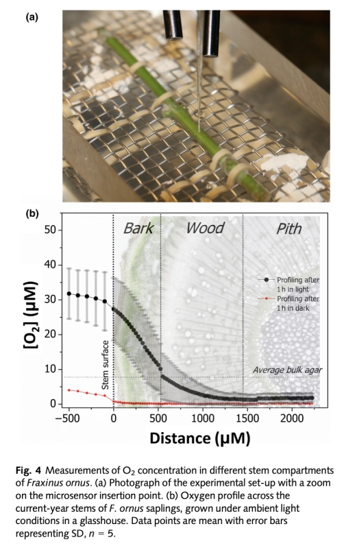 氧氣交換速率測量:利用微傳感器技術(shù)測定黑暗和光照條件下莖部整體、樹皮和木材的凈氧氣交換速率(圖2、3)。