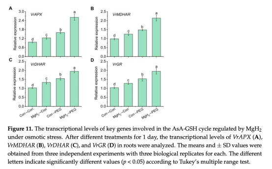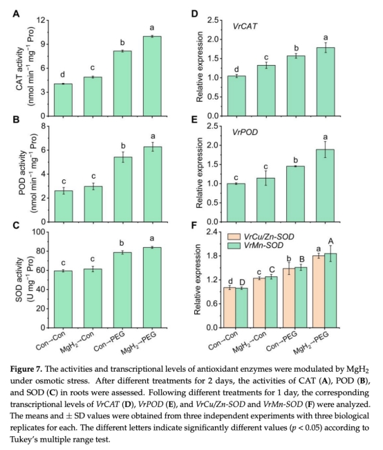 意義:證明滲透脅迫誘導(dǎo)內(nèi)源H2生成,而MgH2預(yù)處理進(jìn)一步增加H2水平35.7%,表明其通過H2信號通路發(fā)揮作用