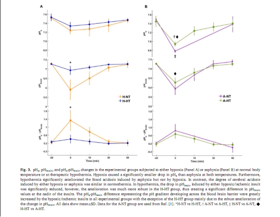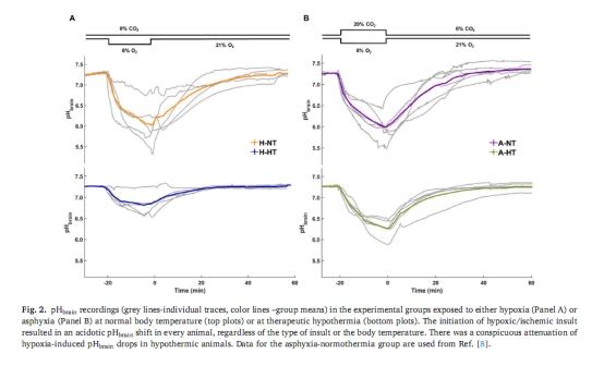 常溫條件下,缺氧和窒息均導致嚴重的腦酸中毒(pHbrain最低降至~5.9),且腦酸中毒程度遠超動脈血酸中毒(pHa最低降至7.24-6.78)。