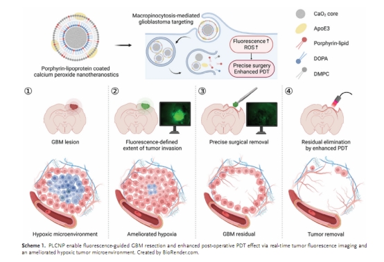 論文提出了一種自拆卸產(chǎn)氧的卟啉脂蛋白納米顆粒(PLCNP),用于膠質(zhì)母細胞瘤(GBM)的熒光引導手術(FGS)和增強光動力治療(PDT)。PLCNP通過巨胞飲作用靶向GBM,其CaO?核心減少卟啉脂質(zhì)的自淬滅效應,提高熒光強度;同時,CaO?在酸性溶酶體中分解產(chǎn)氧,緩解腫瘤缺氧微環(huán)境,增強PDT療效并抑制缺氧誘導的腫瘤進展。