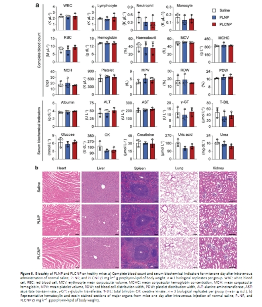 安全性與臨床潛力:低劑量(5 mg/kg卟啉脂質(zhì))即可顯著延長生存期,且無顯著毒性(圖6)。