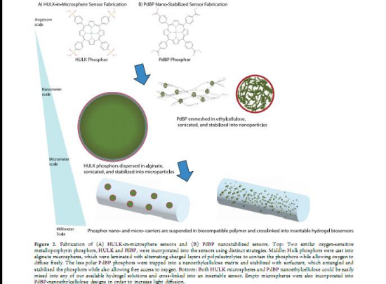 使用兩種氧敏感磷光體(HULK和PdBP),分別通過微球封裝(HULK-in-microspheres)和納米纖維網絡穩定(PdBP-in-nanoethylcellulose)。