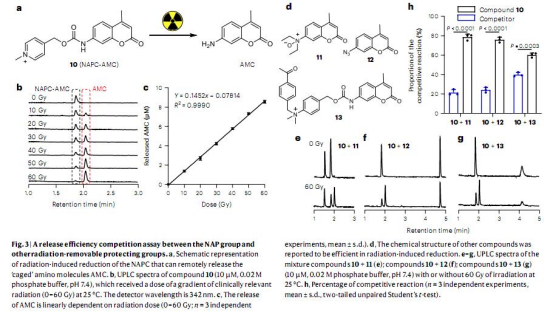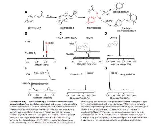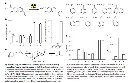 2. 機制驗證:結合理論計算和實驗(如自由基捕獲、UPLC-MS分析),揭示NAP通過捕獲e?aq觸發C-O鍵斷裂釋放功能分子的機制(圖2e-f,Extended Data Fig.1)。