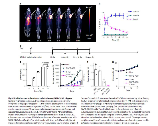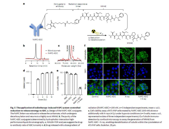 ADC構建:將NAP保護基整合到靶向FAP的ADC中(sibrotuzumab-NAPC-MMAE),通過放療激活釋放毒素MMAE(圖5-6)。