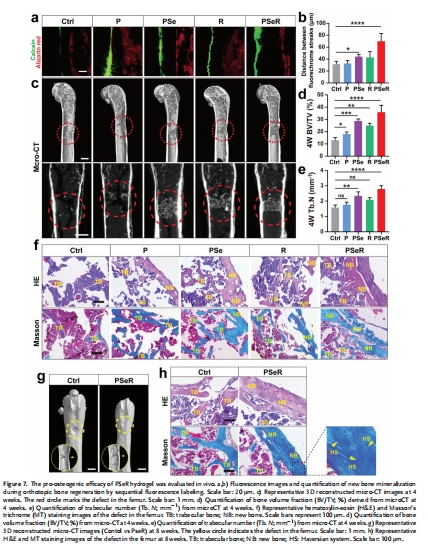 圖7d-e:Micro-CT顯示PSeR組骨體積分數(BV/TV)提升2.75倍,骨小梁數量(Tb.N)增加。