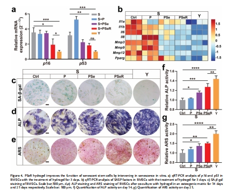 圖4d-g:ALP/ARS染色證實PSeR顯著提升衰老BMSCs的成骨分化能力。