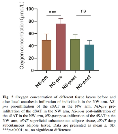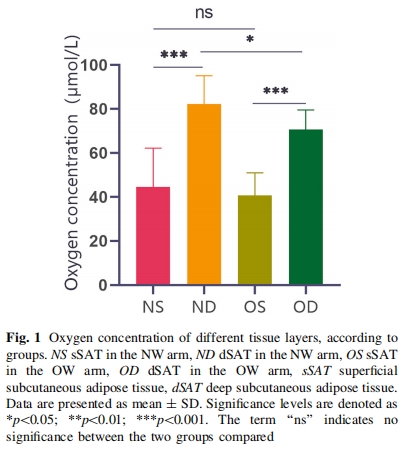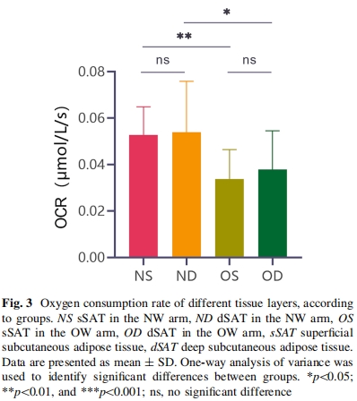 方法:按BMI將腹部吸脂手術(shù)患者分為正常體重組(NW, BMI 18–24 kg/m2)和超重肥胖組(OW, BMI>24 kg/m2),測量淺層(sSAT)與深層皮下脂肪(dSAT)的氧濃度、耗氧率(OCR)、脂肪細(xì)胞面積和毛細(xì)血管密度。