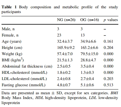 BMI與代謝指標(biāo) 表1 OW組腹部脂肪更厚、HDL更低,提示肥胖伴隨代謝紊亂。