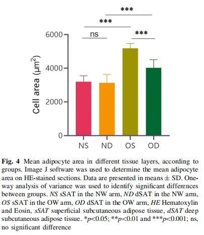 脂肪細(xì)胞面積 圖4 OW組細(xì)胞面積顯著大于NW組;sSAT細(xì)胞面積大于dSAT(僅OW組)。說明細(xì)胞肥大阻礙氧擴(kuò)散,導(dǎo)致缺氧。