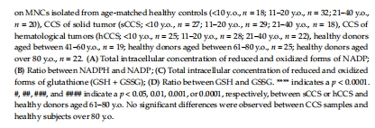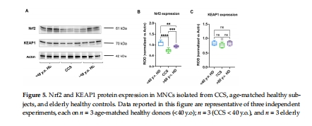 發現:CCS的單核細胞(MNCs)存在抗氧化防御受損(谷胱甘肽通路酶活性降低)和氧化損傷累積(脂質、DNA、蛋白質損傷),類似老年人水平。機制上由Nrf2表達下調驅動。
