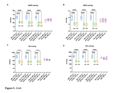 關鍵酶活性↓:G6PD、H6PD(NADPH生成)、GR、GPx(谷胱甘肽代謝)、SOD、CAT(圖3A-D, 圖4A-B)。