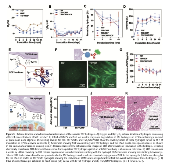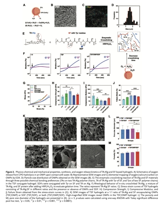測試水凝膠的機械性能(壓縮模量、粘附性)、孔隙結構、降解行為、氧氣/H?O?/SDF釋放動力學(圖2F-M,圖3A-G)。