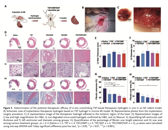水凝膠壓縮模量(圖2H-I):TSF/OMP/SDF模量最高(≈55.8 kPa)。意義:匹配心肌力學環境(30-70 kPa),提供機械支撐。