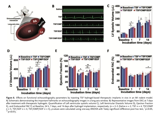 心功能(圖8C-E):治療后7天,TSF/OMP/SDF組射血分數(EF)提高≈25%,左心室收縮功能改善。意義:直接證實治療策略改善心臟泵血能力。