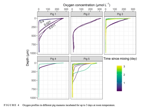 使用丹麥Unisense微電極測量5類豬糞的溶解氧梯度,擬合O?消耗動力學參數(r???和K??)。
