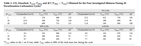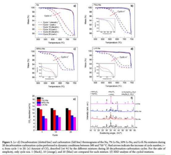 熱重?cái)?shù)據(jù)(圖3, 8a):量化CO?釋放/吸收質(zhì)量變化(表3-4),反映脫碳/碳酸化反應(yīng)程度。意義:直接評(píng)估循環(huán)可逆性,揭示含鋰混合物首周期后容量驟降(如50%Li-Na從15.2wt%降至6wt%)。