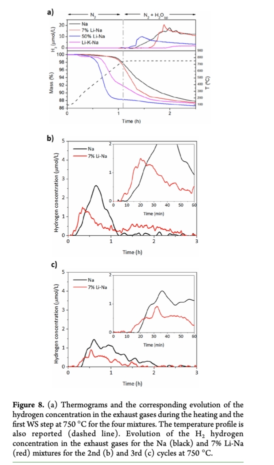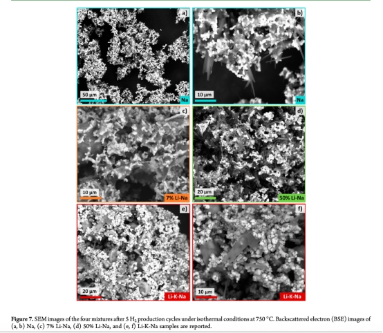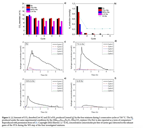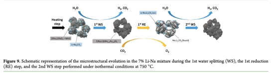 動(dòng)力學(xué)機(jī)制解析:直接關(guān)聯(lián)產(chǎn)氫速率與反應(yīng)進(jìn)程。例如圖8a顯示7%Li-Na在第二周期比Na混合物早5分鐘啟動(dòng)產(chǎn)氫,且峰值前移,證明熔融碳酸鹽在等溫再生步驟(750°C)形成液相,加速了水分解反應(yīng)的離子遷移(圖9)。