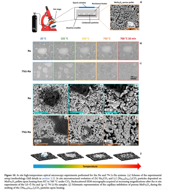 原位光學(xué)顯微(圖10):實(shí)時(shí)追蹤加熱過程。意義:直接驗(yàn)證7%Li-Na在750°C下熔融并滲透多孔MnFe?O?(圖10c,j),解釋動(dòng)力學(xué)提升但燒結(jié)加劇的矛盾。