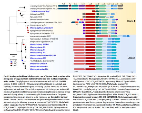 分析1,200+個甲烷氧化菌基因組,發(fā)現(xiàn)來自Pseudomonadota、Verrucomicrobiota和Gemmatimonadota門的菌株含clade I/II nosZ基因(圖1,補充數(shù)據(jù)集1)。