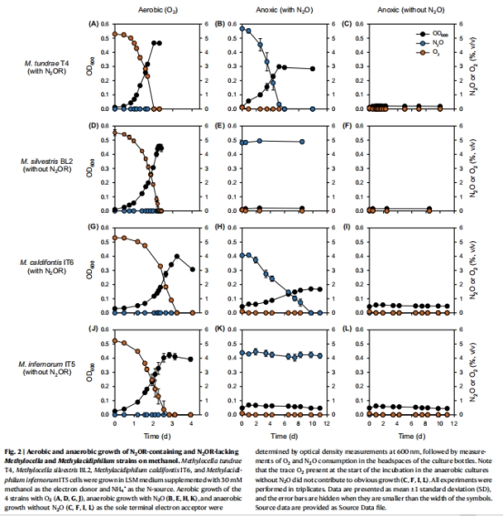M. tundrae T4和M. caldifontis IT6在厭氧條件下以N?O為電子受體生長(OD???↑),N?O被還原至N?;陰性對照菌(無nosZ)不生長。