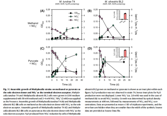 選擇含完整nos操縱子的菌株(M. tundrae T4和M. caldifontis IT6)進行厭氧培養(yǎng),以甲醇、丙酮醇、丙酮酸或H?為電子供體,N?O為電子受體(圖2)。