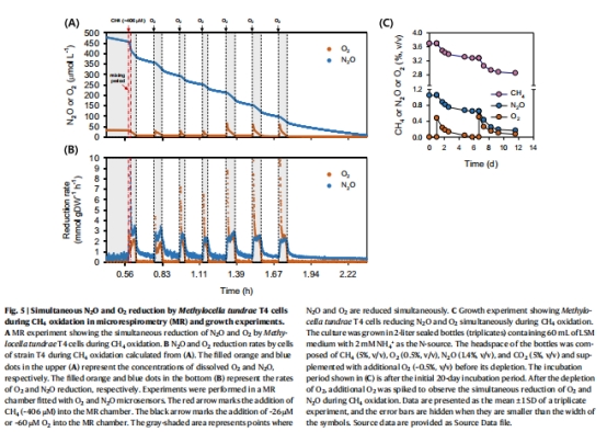 Methylocella tundrae在低氧條件下同時消耗CH?和N?O,其N?O還原酶(N?OR)在O?存在時仍保持活性。