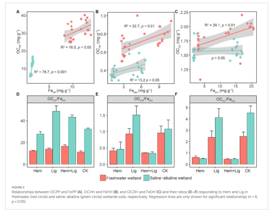 Lig促進Fe-OC形成,導致OC凈積累(淡水濕地:5.9±3.6 mg g?1;鹽堿濕地:8.3±3.2 mg g?1)。