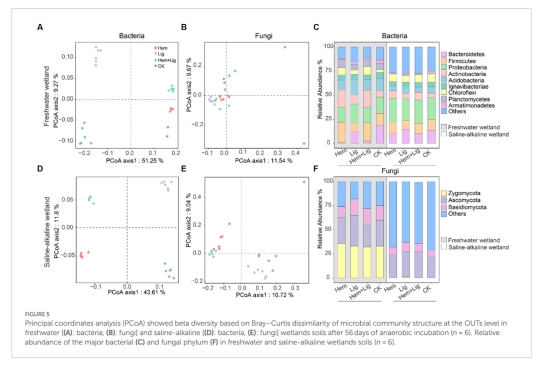 摘要指出:鐵氧化物(Fe)可通過吸附和共沉淀穩定有機碳(OC),但微生物鐵還原會破壞鐵結合有機碳(Fe-OC)并促進OC礦化。本研究通過向淡水和鹽堿濕地土壤中添加結晶鐵氧化物(赤鐵礦,Hem)和老舊碳(褐煤,Lig),探究兩者對OC平衡的影響。結果顯示: