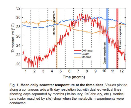數(shù)據(jù):5年日均海水溫度(Moorea: 28.0±0.1°C;Guam: 28.9±<0.1°C;Okinawa: 25.1±0.2°C)。
