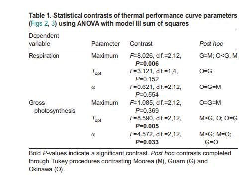 意義:揭示代謝對溫度的響應(yīng)模式,顯示高緯度(Okinawa)呼吸最大值顯著降低(表1),光合作用 Topt 在Moorea更高。