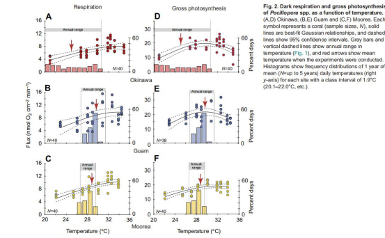 光合速率范圍:Okinawa 5.1–26.1;Guam 11.4–31.9;Moorea 10.6–23.2。