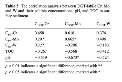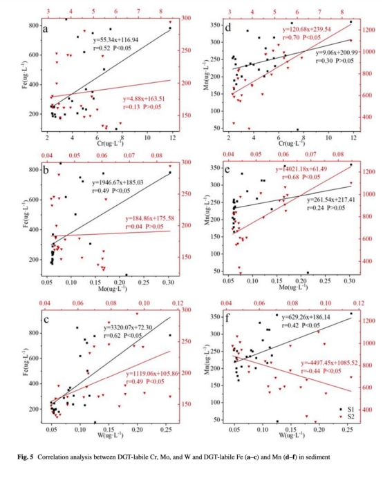 Cr、Mo、W的遷移受鐵錳氧化物還原溶解控制:DGT有效態(tài)濃度與Fe/Mn顯著正相關(guān)(圖5a-f),且還原層(-12mm)出現(xiàn)同步峰值(圖3)