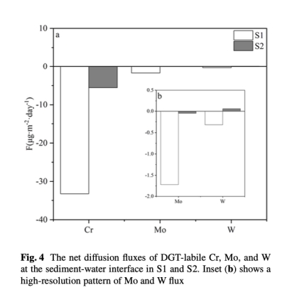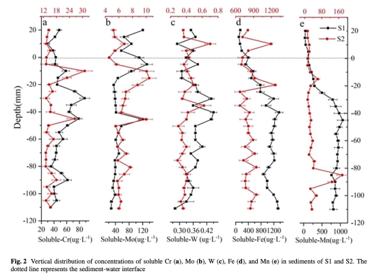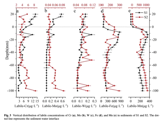 酸化驅(qū)動的金屬活化:電極測得沉積物還原層pH降低(研究未直接展示數(shù)據(jù)但文本提及),與Cr/Mo/W有效態(tài)濃度升高(圖3)及Fe/Mn還原溶解(圖2d-e)空間匹配,證實(shí)酸化促進(jìn)金屬從氧化物表面解吸
