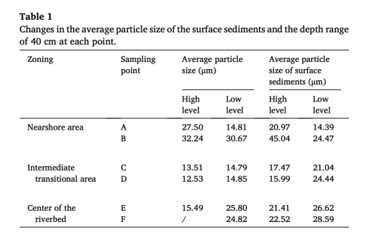 數據:表層沉積物平均粒徑(如近岸區A點豐水期27.50 μm → 枯水期14.81 μm)、砂指數/粉砂指數。