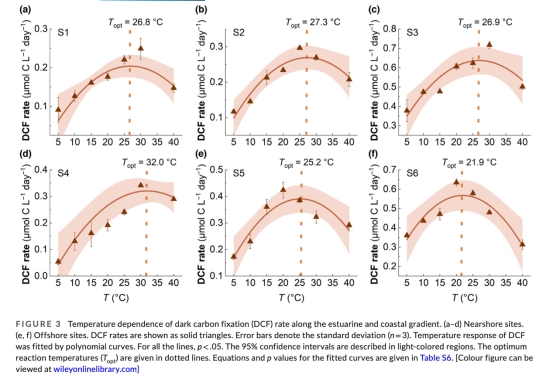 數(shù)據(jù):不同溫度下DCF速率(0.05–0.72 μmol C L?1 day?1)及Topt(近岸站點26.8–32.0°C,離岸站點21.9–25.2°C)。