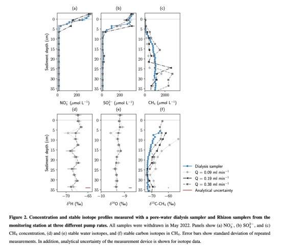 Rhizon采樣器適用于溶解性物質(zhì)(如離子)的重復(fù)采樣,但氣體(CH?)濃度和同位素組成受抽水速率顯著影響(圖2c,f)。