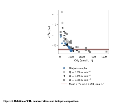 數(shù)據(jù):CH?濃度隨抽水速率升高而增加且變異性增大;δ13C-CH?在低濃度(<950 μmol/L)時(shí)分餾顯著(最高-65.9‰ vs. peeper的-71.2‰)。