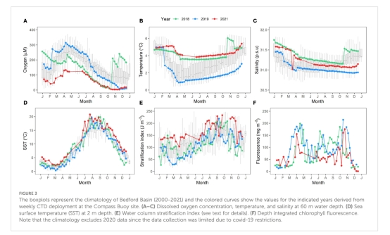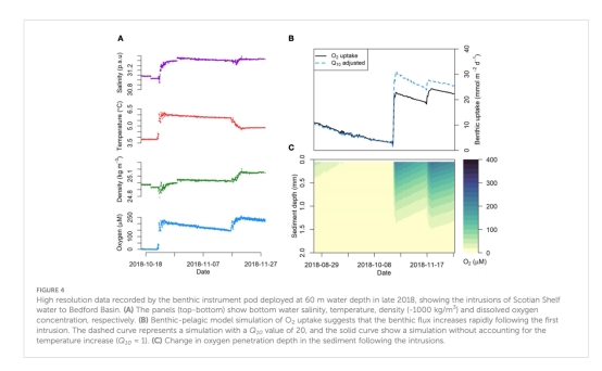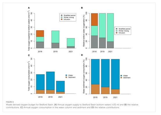 研究通過耦合水柱-沉積物模型,結(jié)合長(zhǎng)期監(jiān)測(cè)數(shù)據(jù)(溫鹽、溶解氧、葉綠素?zé)晒猓┖统练e物微剖面測(cè)量,量化了加拿大貝德福德盆地(Bedford Basin)底層水氧氣的來(lái)源與消耗。關(guān)鍵發(fā)現(xiàn):