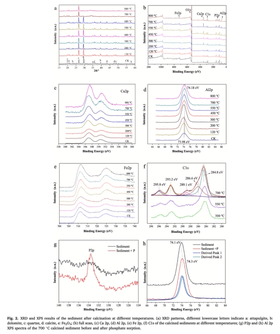 磷固定機制:煅燒(>500°C)促進CaCO3分解為CaO,通過化學沉淀形成穩定Ca-P(圖2c);同時Fe/Al氧化物暴露增強磷吸附(圖2d-e)。